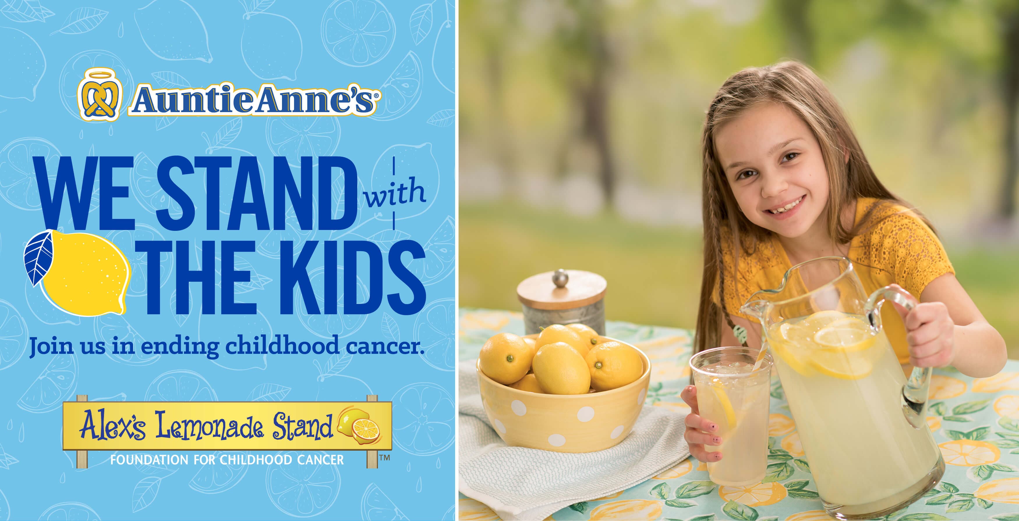 LANCASTER, Pa., September 1, 2020 – Auntie Anne's®, the world's largest hand-rolled soft pretzel franchise, is once again partnering with Alex's Lemonade Stand Foundation, to take a stand to end childhood cancer this September. With support from franchisees, team members, corporate associates, and guests, Auntie Anne’s has raised more than $5.1 million to help fund life-saving research and treatments since 2011.Now, with support needed more than ever, the iconic pretzel brand is once again asking fans to join them in raising funds for research in the fight against childhood cancer. In honor of Childhood Cancer Awareness month, guests can donate to ALSF at participating Auntie Anne’s stores or when they order in the Pretzel Perks app from September 1-30. One hundred percent of these funds will be donated to ALSF. As a token of appreciation, app users who donate in-store or online will receive an offer for a buy one, get one free pretzel on their next Auntie Anne’s purchase.“Auntie Anne’s was founded in 1988 on the principle of caring for others and we’re proud to continue that mission today with our ongoing support of Alex’s Lemonade Stand Foundation,” said Heather Neary, president of Auntie Anne’s. “This year, supporting organizations like ALSF is even more important as their fundraising efforts have been dramatically impacted by the global pandemic. We’re asking our guests to join us in funding research for childhood cancer by donating to ALSF in-stores or in our app this September. Plus, they’ll receive a great offer when they donate so it’s a win-win!”“Auntie Anne’s has always been an extremely generous partner, but we are especially grateful for their continued support this year. Pediatric cancer research depends on organizations like ours to fund new cures and less toxic treatments. Through campaigns with partners like Auntie Anne’s, we are able to raise awareness of and funds for childhood cancer research,” said Liz Scott, Alex’s Mom and Co-Executive Director of Alex’s Lemonade Stand Foundation. “Together, we can find cures and end childhood cancer.”Additionally, Auntie Anne’s is adding a new collection of pretzel and lemon-inspired clothing and accessories to their online Threadless shop. Fans can purchase these unique designs to showcase their love of pretzels and support for ALSF, as all profits from collection sales are donated to ALSF. To find an Auntie Anne's location near you to donate to Alex's Lemonade Stand Foundation, please visit order.auntieannes.com.